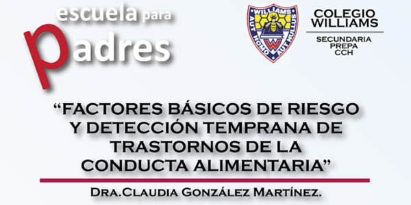 Estimados Padres de Familia, Colegio Williams les hace una cordial invitación a nuestra Escuela para Padres con la conferencia titulada: “Factores básicos de riesgo y detección temprana de trastornos de la conducta alimentaria” que será impartida por la Dra. Claudia González Martínez.